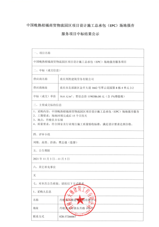 【大雅建筑公司】中國晚熟柑橘商貿物流園區項目設計施工總承包(EPC)場(chǎng)地強夯服務(wù)項目中標結果公示